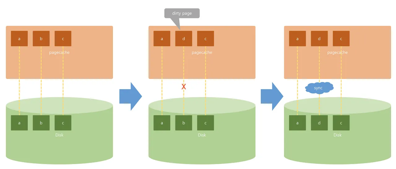 맨 처음 pagecache에 있는 데이터와 디스크에 있는 데이터는 동일한 데이터를 유지